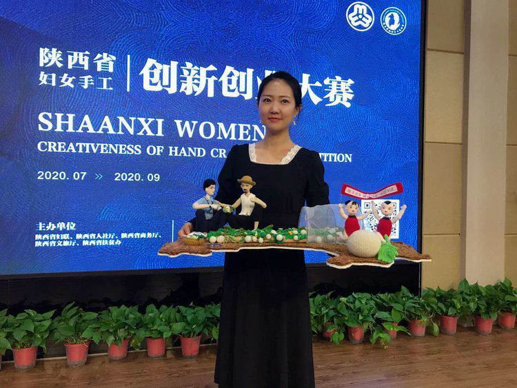 阎良毛线编织传承人刘翠的作品以阎良甜瓜为核心元素,突出精准扶贫、科技助农、利国利民主题,展现阎良新农村新面貌新生活,获大赛金奖。