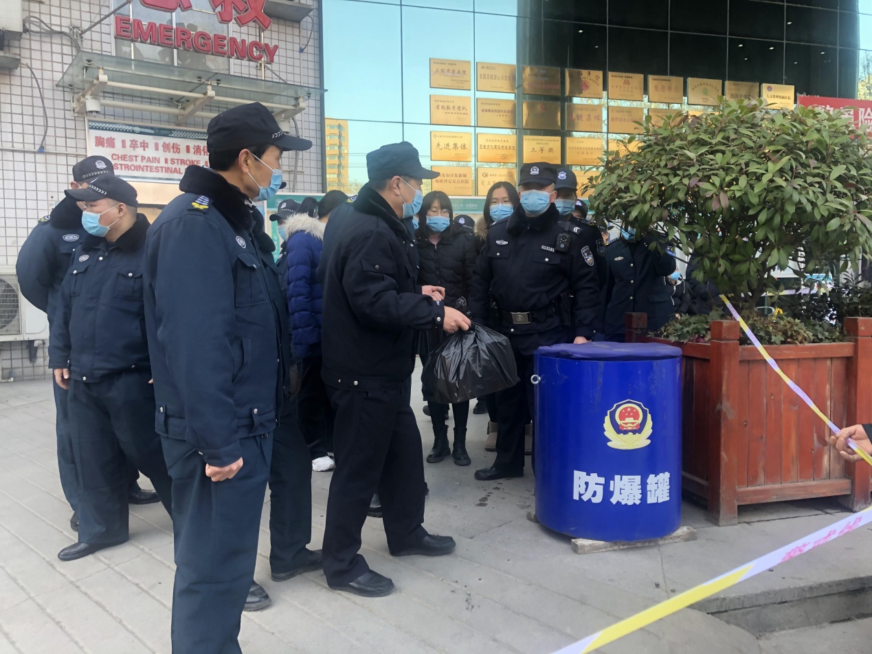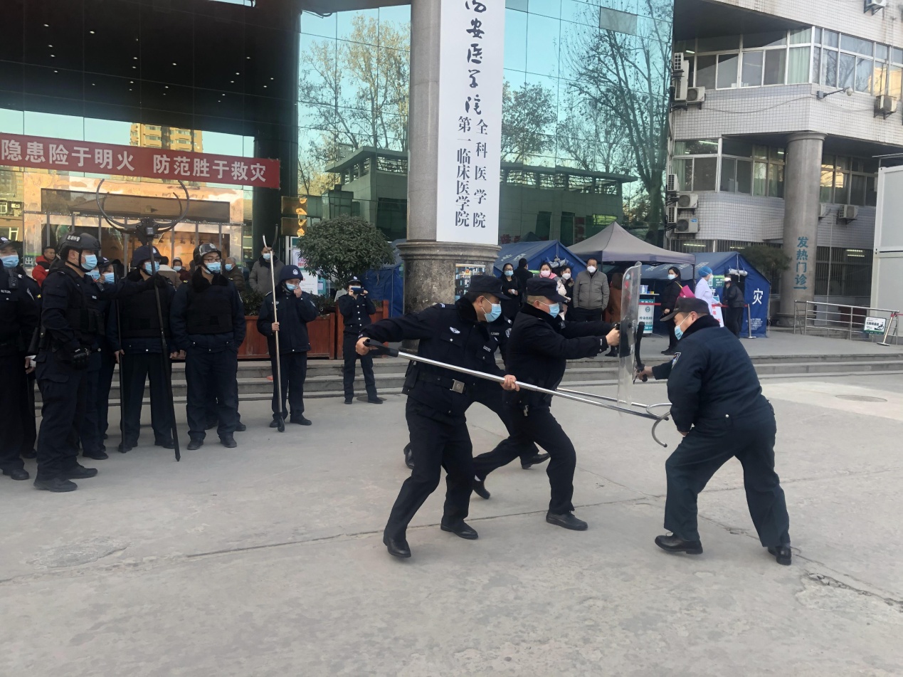 培训演练围绕反恐 、防暴 、防疫三个方面展开,民警先为安保人员演示了钢叉、盾牌和警棍的使用技巧,然后演示了三者如何配合使用发挥最大效果,之后,将安保人员分组进行实战对抗演练并进行详细的指导;对抗演练结束后,安保人员模拟门诊楼发现可疑爆炸异物,并以此开展了疏散演练,对车辆逃逸及车辆冲击医院的突发事件进行了处置演练;在疫情防控方面,邀请发热门诊护士培训安保人员穿脱防护服等,以应对可能出现的疑似人员拒不配合疫情防控工作等。