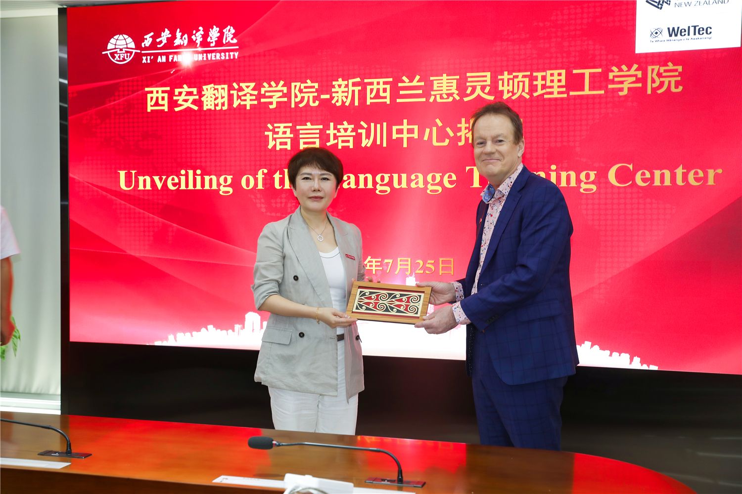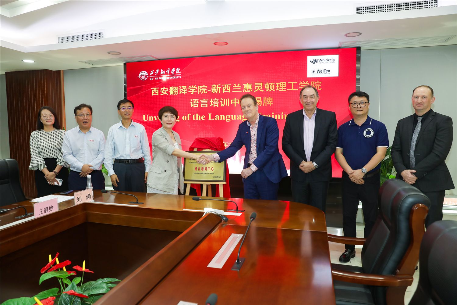 会上,丁晶与Mark Oldershaw共同为“西安翻译学院-新西兰惠灵顿理工学院语言培训中心”揭牌。此次语言培训中心揭牌标志着西译与新西兰惠灵顿理工学院的合作迈出重要一步,不仅使西译国际化教育再上新台阶,同时也引进了新西兰优质高等教育资源,对西译师生拓宽国际化视野、提升跨文化交际能力发挥了重要作用。
