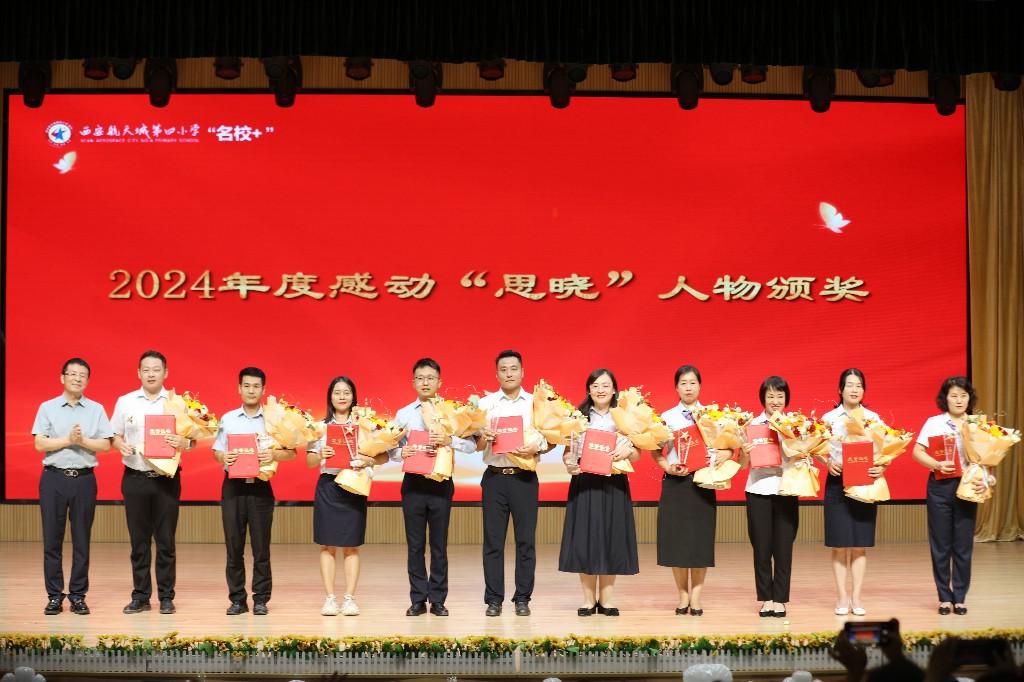 庆祝大会上,学校还向表现卓越的“感动四小”“感动六小”“思晓之光”代表及“教学提质先锋团队”颁发特别荣誉。当灯光亮起,音乐奏响,老师们暂别讲台,登上舞台,化身为歌者、舞者、演员,尽情释放着自己的激情与才华。最后,一首“嫽扎咧”的《长安行》更是表达了老师们如何将对家乡的爱融入教育中,培养出一个又一个承载着家乡希望与梦想的孩子。