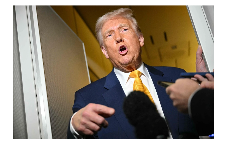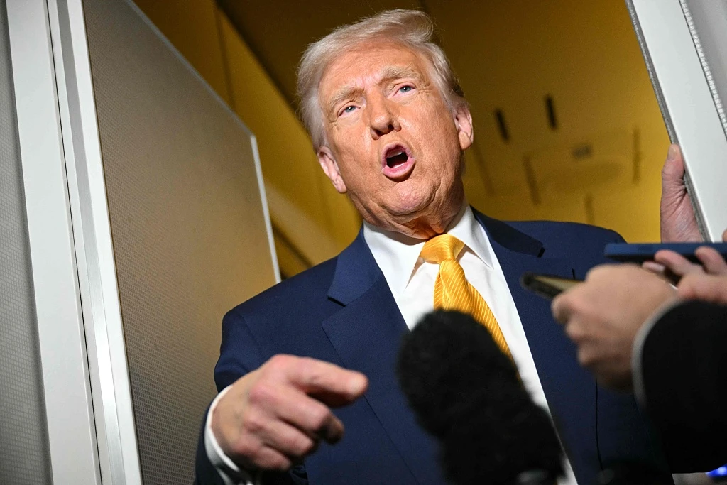 当地时间2025年4月12日,特朗普前往迈阿密准备出席UFC314比赛,在空军一号上对记者发表讲话 视觉中国