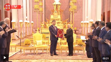 当地时间4月17日下午,国家主席习近平在金边王宫接受西哈莫尼国王授予的“柬埔寨王国民族独立大项链级勋章”。