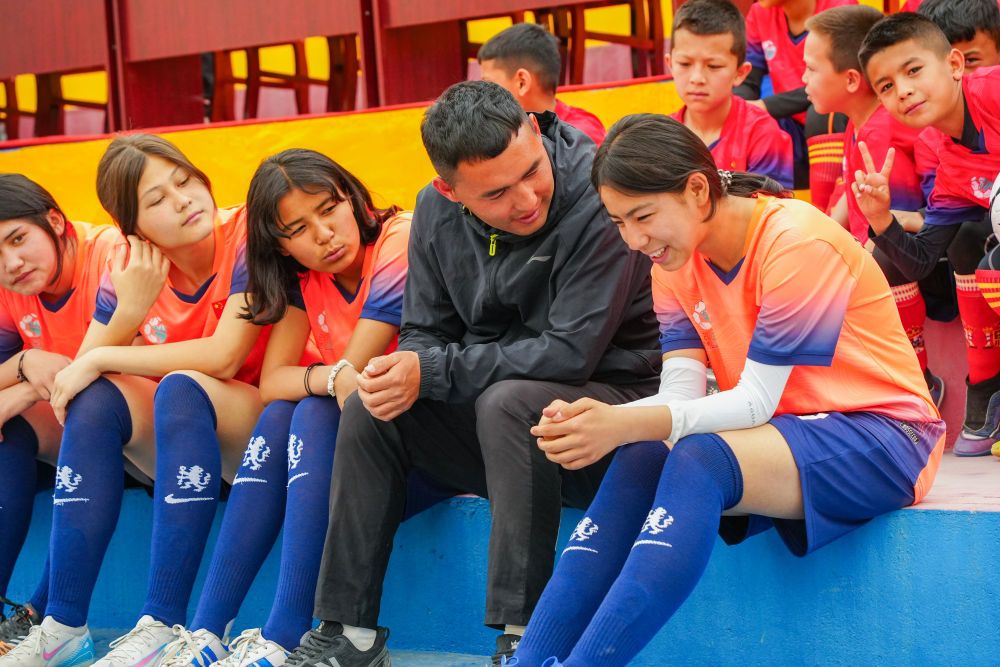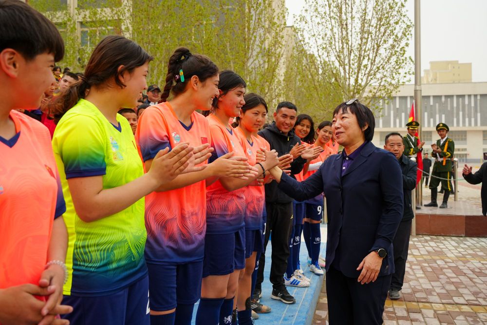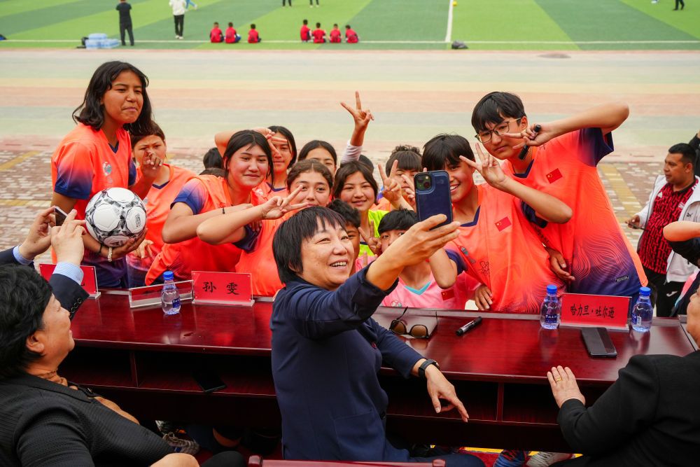 ↑4月12日,2025新疆克孜勒苏柯尔克孜自治州足球联赛开幕式后,中国足协副主席、前中国国家女子足球队球员孙雯(前右一)与阿图什市U13女子足球队队员阿依谢·托乎达洪(左三)交流。新华社记者 徐宏岩 摄