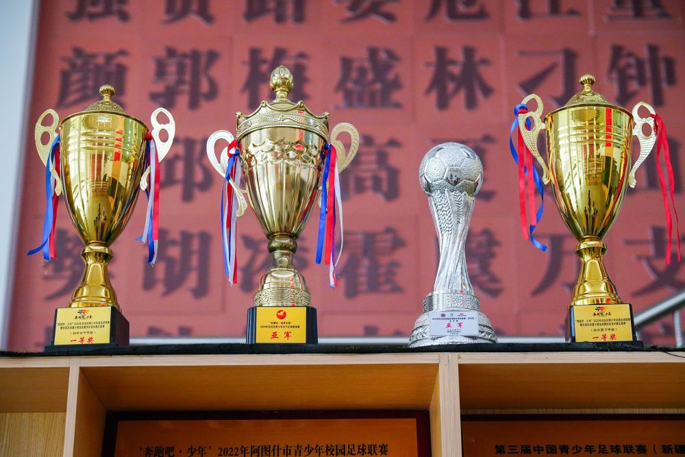 ↑这是4月14日在新疆克孜勒苏柯尔克孜自治州阿图什市硝鲁克中学拍摄的奖杯。新华社记者 徐宏岩 摄