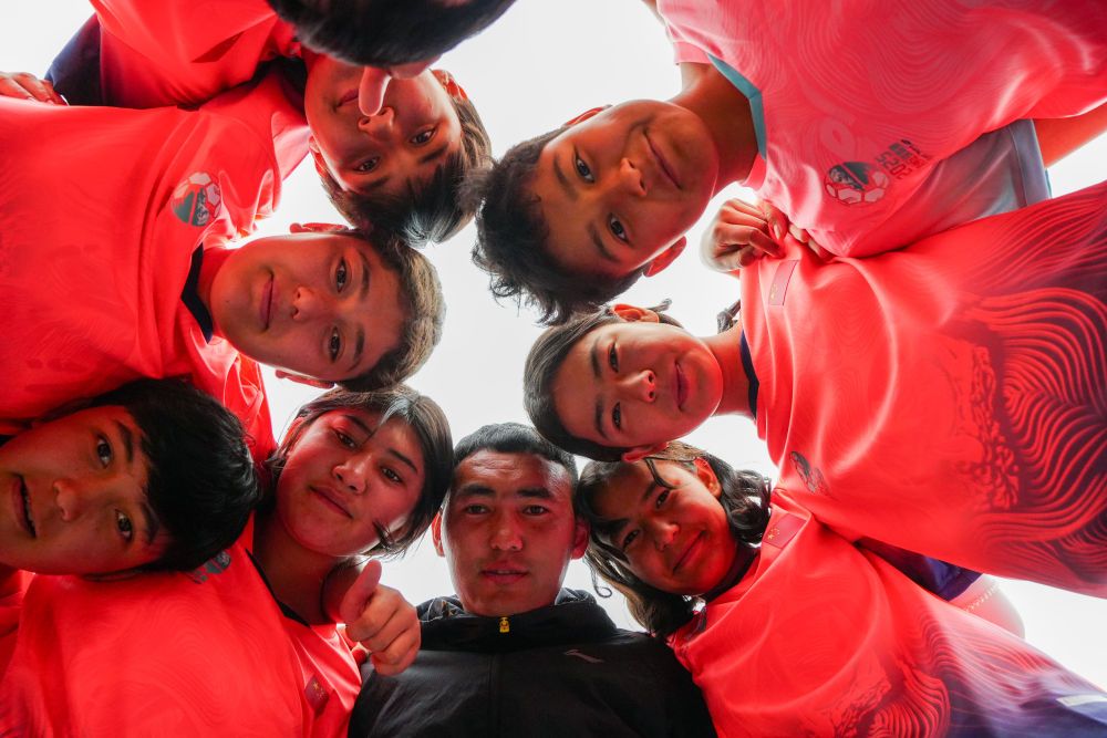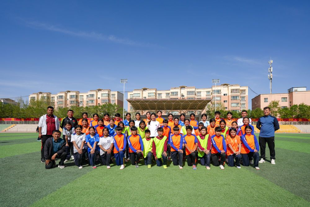↑4月12日,在2025新疆克孜勒苏柯尔克孜自治州足球联赛开幕式后,中国足协副主席、前中国国家女子足球队球员孙雯(前)与阿图什市U13女子足球队合影。新华社记者 徐宏岩 摄