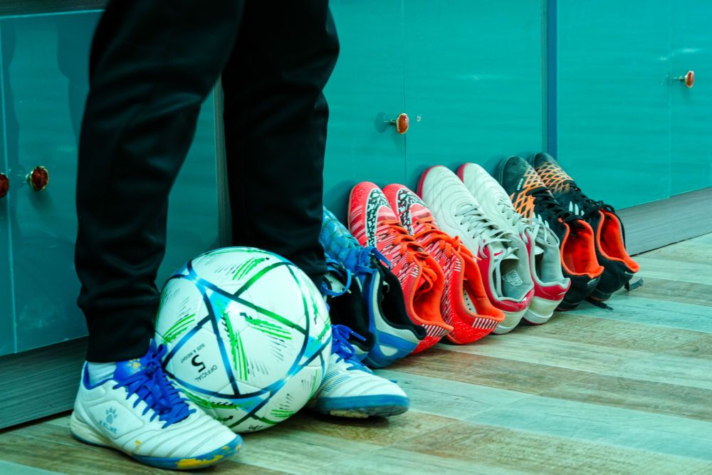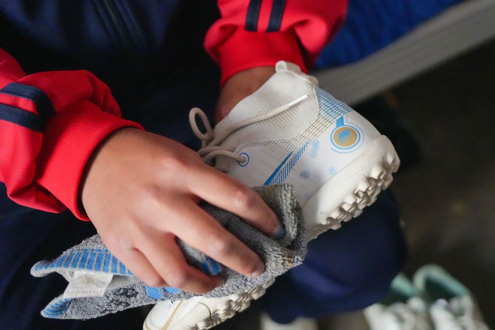 ↑4月10日,在阿图什市硝鲁克中学宿舍,一名球队球员在擦拭自己心爱的球鞋。球员们的装备由学校免费发放。新华社记者 徐宏岩 摄