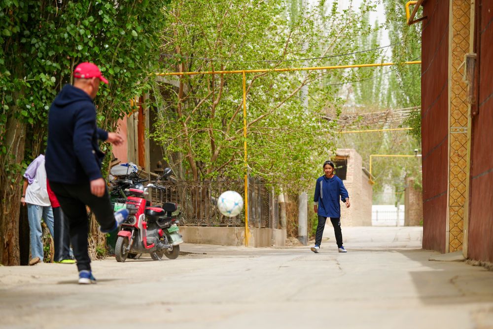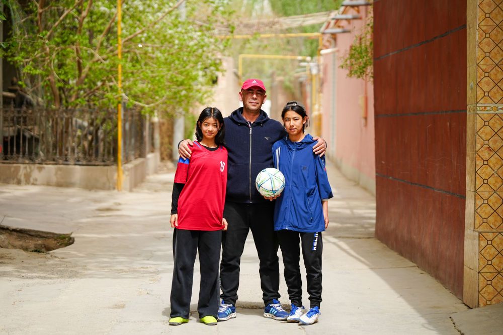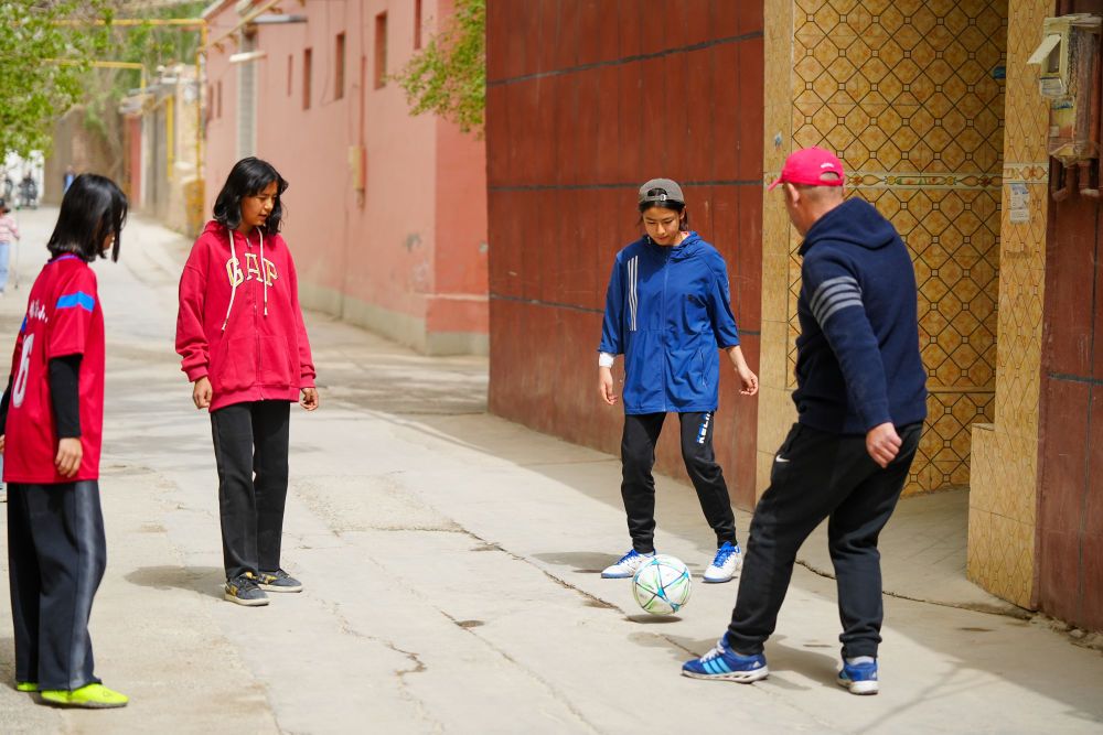 ↑4月13日,在阿图什市亚喀巴格村,乃菲赛(右二)与父亲、妹妹(左一)、艾妮再(左二)一起踢球。新华社记者 徐宏岩 摄