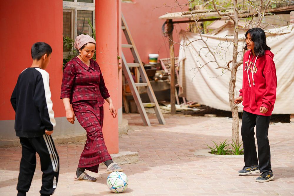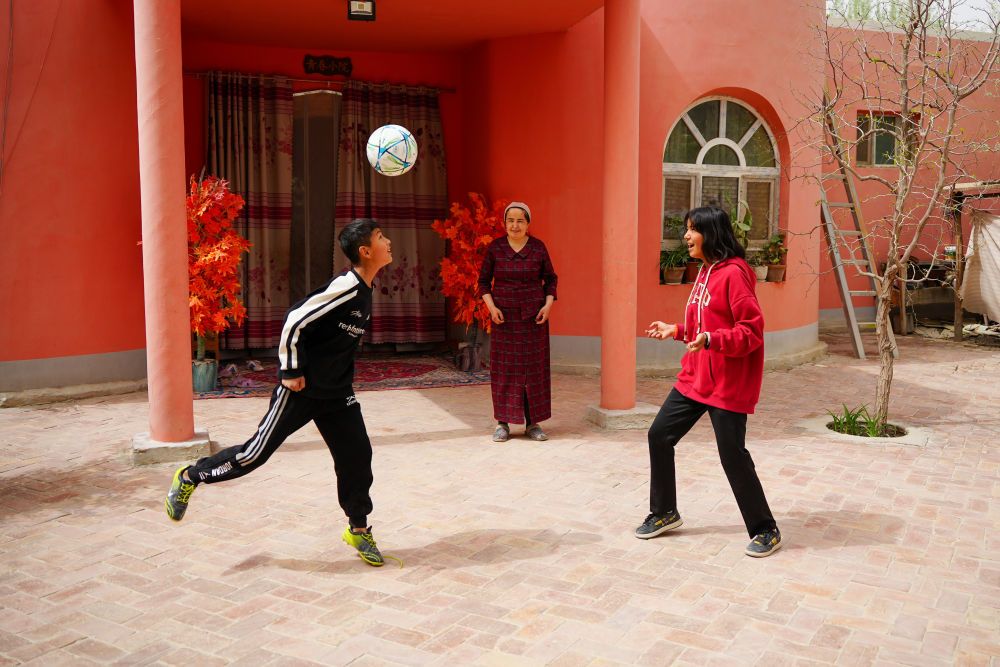 ↑4月13日,在阿图什市亚喀巴格村,艾妮再(右)在家中的院子里和母亲、弟弟一起踢球。新华社记者 徐宏岩 摄