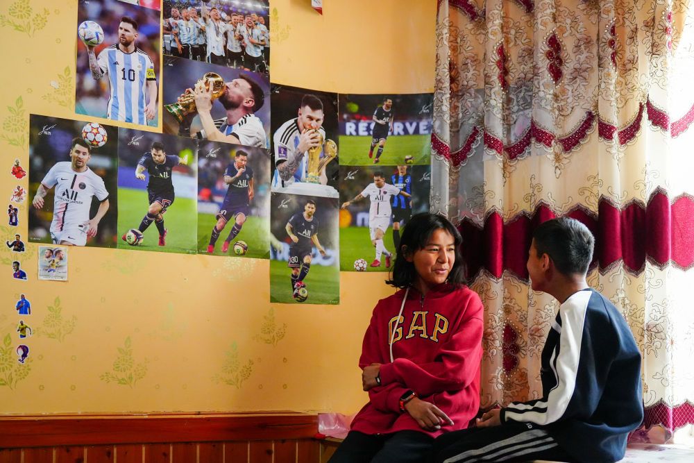 ↑4月13日,在阿图什市亚喀巴格村,艾妮再(左一)在家中与弟弟聊天。新华社记者 徐宏岩 摄