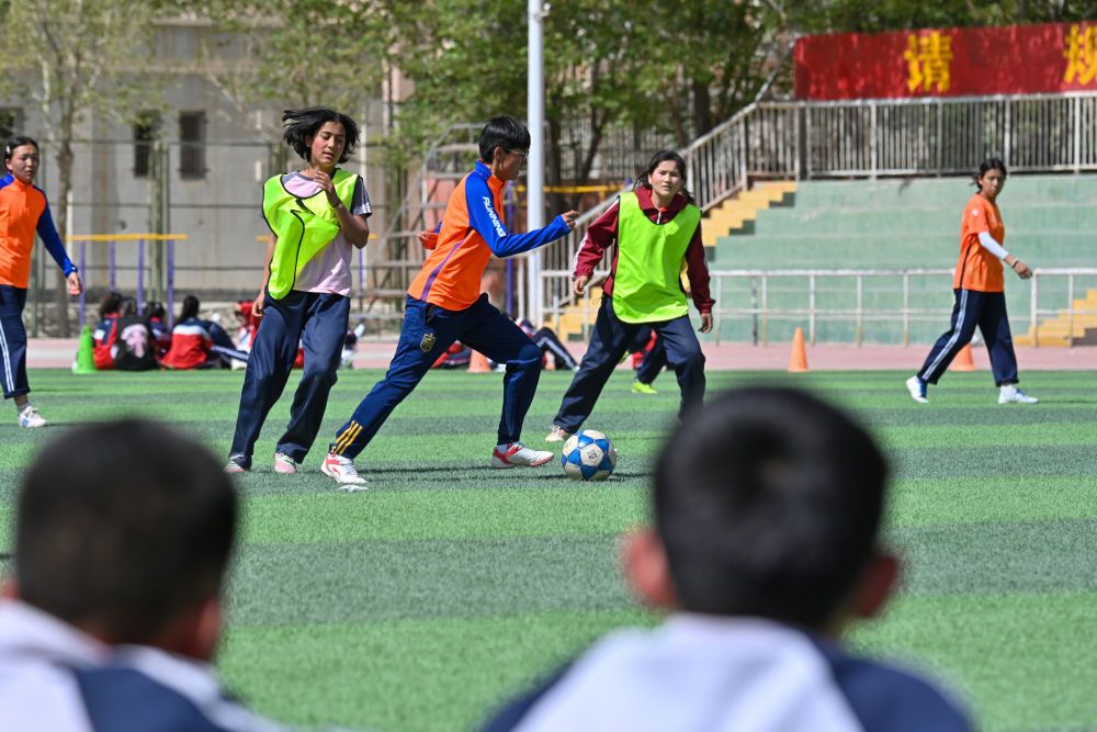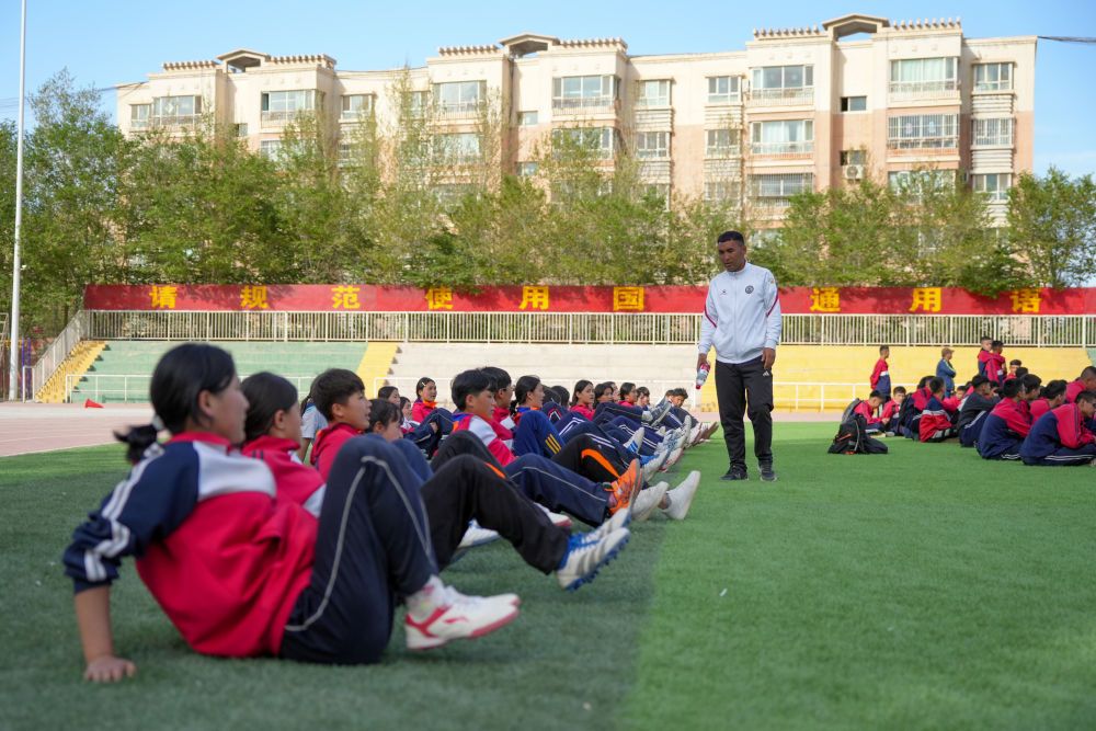 ↑4月10日,在阿图什市硝鲁克中学,队员们在教练如扎吉的指导下进行训练。新华社记者 徐宏岩 摄