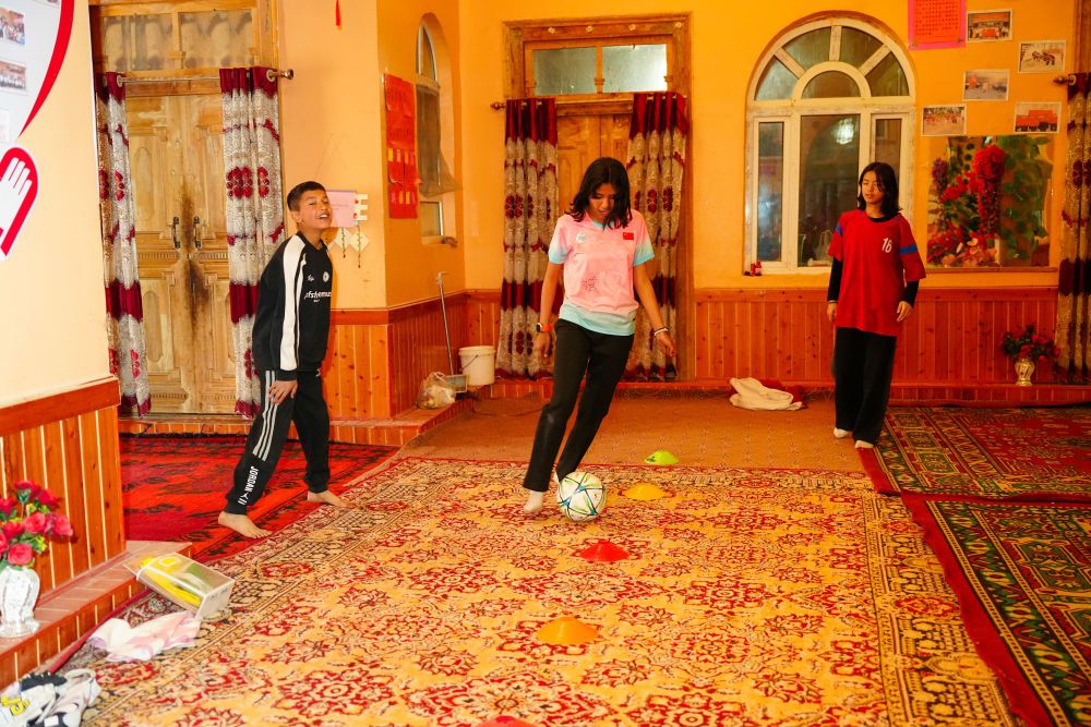 ↑4月13日,在阿图什市亚喀巴格村,艾妮再(中)在家中与弟弟和朋友比拼带球技术。新华社记者 徐宏岩 摄