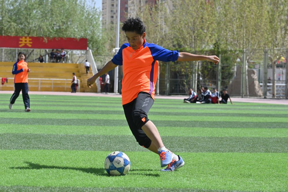 ↑在阿图什市硝鲁克中学,球队前锋谢尔克努尔·亚力坤在训练赛中带球进攻。新华社记者 徐宏岩 摄