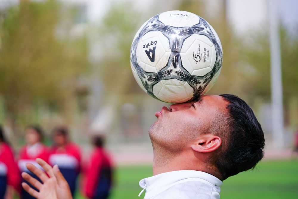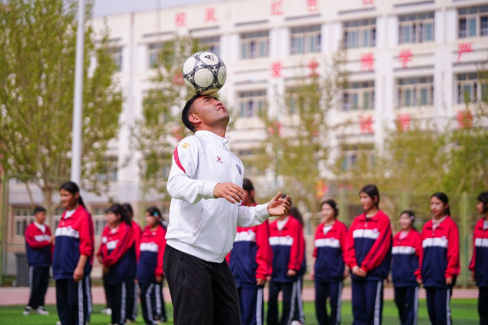 ↑4月14日,在阿图什市硝鲁克中学,教练如扎吉为队员演示头部停球。新华社记者 徐宏岩 摄