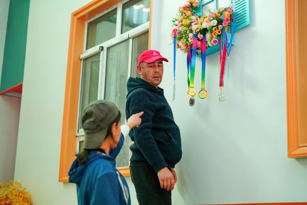 ↑4月13日,在阿图什市亚喀巴格村,乃菲赛的父亲帮女儿整理奖牌和参赛证件。新华社记者 徐宏岩 摄