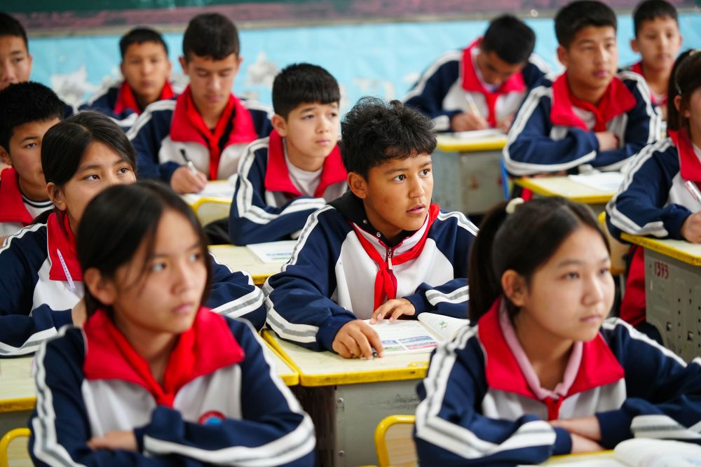 ↑4月14日,在阿图什市硝鲁克中学,球队前锋谢尔克努尔·亚力坤(二排左二)在教室里上课。新华社记者 徐宏岩 摄
