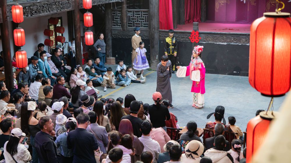 穿过浪漫的法式田园,来到景区的水墨古村,又是另一番中式风情。记者探访时,古戏台正在上演一出古风话剧《不折风骨》,可容纳近400人的院子里座无虚席。不少小朋友在前排席地而坐,演员们走到人群中,与观众零距离互动,将故事娓娓道来。