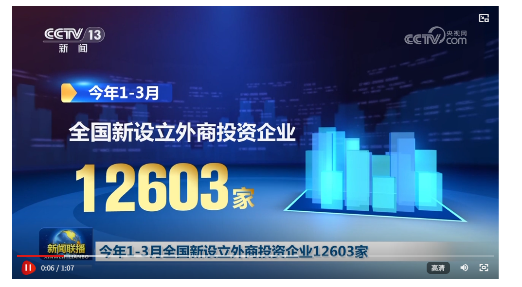 央视网消息(新闻联播):商务部最新数据显示,今年1—3月,全国新设立外商投资企业12603家,同比增长4.3%;实际使用外资金额2692.3亿元人民币。