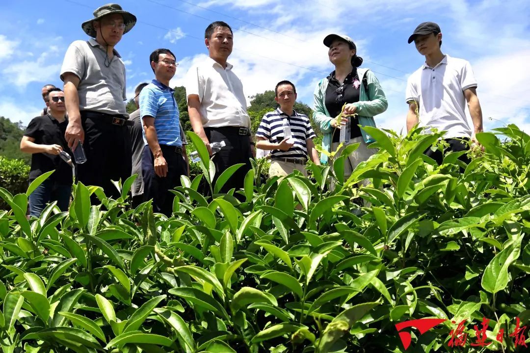 廖红教授(右2)在武夷山燕子窠福莲生态茶庄园介绍科学利用套种大豆、油菜花等作物提高茶叶产量、提升茶叶品质、减少茶树病虫害不使用农药、化肥的做法。福建日报记者 林熙 摄