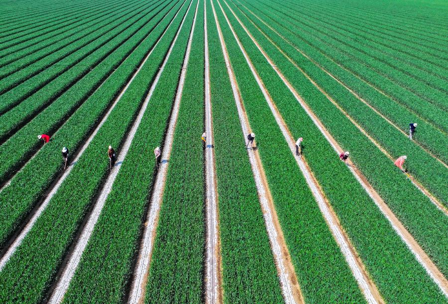 4月20日,在山东省东营市广饶县李鹊镇拐子村的田地里,农民在为覆膜的春玉米打孔(无人机照片)。新华社发(刘云杰摄)