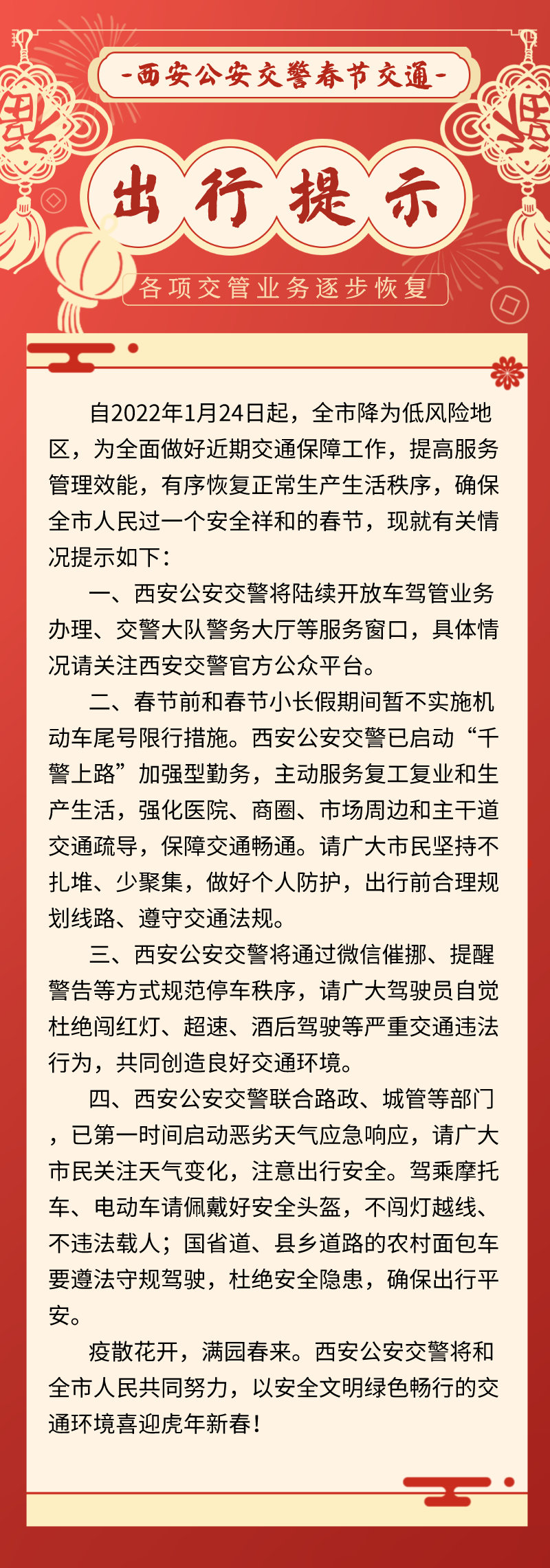 为全面做好近期交通保障工作,提高服务管理效能,有序恢复正常生产生活秩序,确保全市人民过一个安全祥和的春节,1月24日,西安市公安局交通警察支队官方微博发布有关情况提示。具体如下: