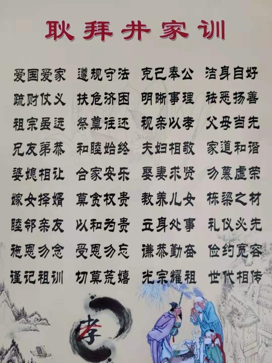 耿拜井是我曾祖父,家训是我四爷(祖父)撰写,我大伯操持编排出来的,并给家族里的每个小家庭都存放了一份。逢年过节,族人都会去祠堂一起拜祭祖先,我家的家训是先辈流传下来的行为准则和处世方法,从推崇忠孝节义,立身处世,道德规范、修身养性、持家治业这几个方面对家族成员进行教诲约束,这份家训对我们家族每位成员的做人格局及处事原则都指明了方向。千万个家庭千万条家训,再简单也会影响后代,启迪后代。希望我们家族的家训源远流长,我们后辈也将时刻铭记家训,做一个正直有孝心的人。