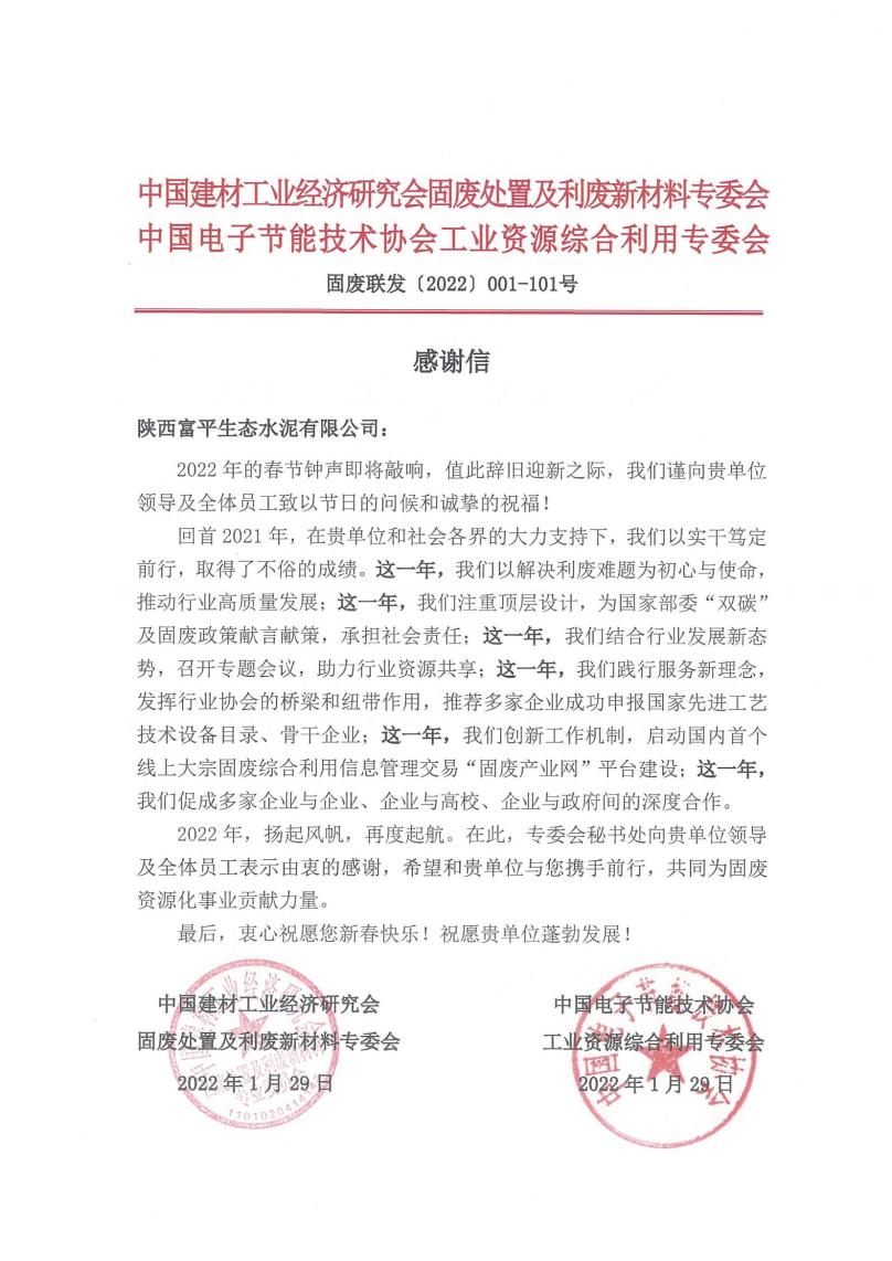 三秦都市报-三秦网讯(通讯员 王钊)1月29日,陕煤生态水泥富平公司收到中国建材工业经济研究会固废处置与利废新材料专委会和中国电子节能技术协会工业资源综合利用专委会发来的联名感谢信,感谢该公司在固废资源化事业上做出的不懈努力和突出贡献。