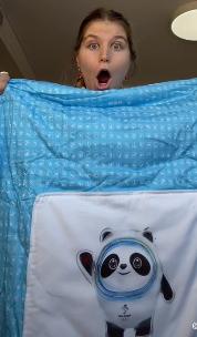 美国运动员展示“冰墩墩”毯子(网络视频截屏)