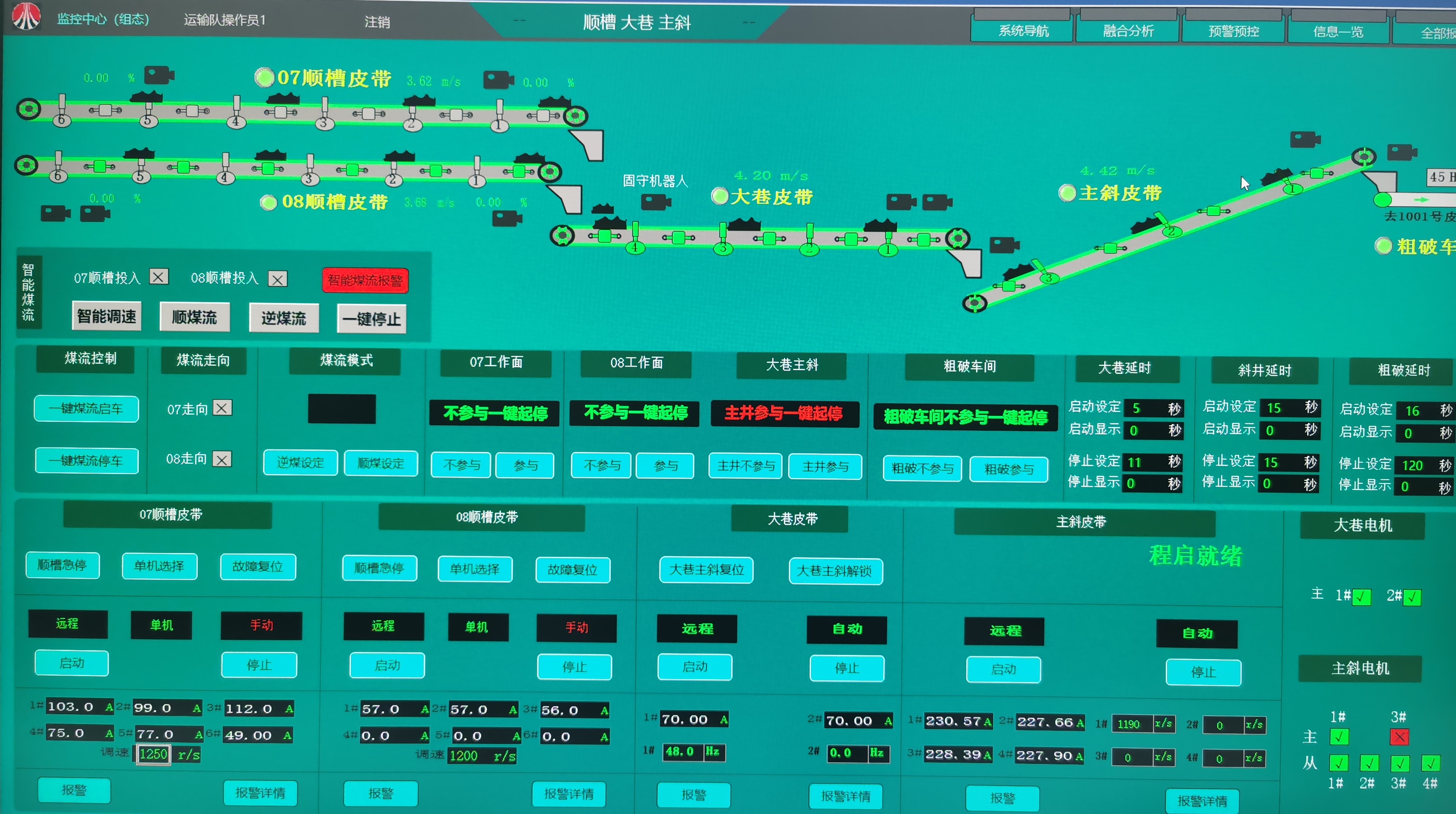 采用皮带逆煤流系统一键启动,3分钟就可以开启皮带,大幅度降低启停时间。智能变频调速系统正式上线,通过煤流量监控装置,实现自动调整系统皮带速度,最大程度减少皮带空载运行时间和轻载运行率,达到降低能耗的效果。