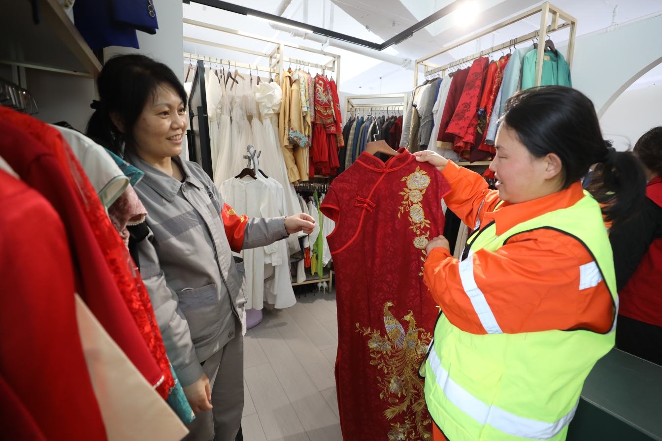 化妆师为两位环卫工化妆,其余环卫工两人一组依次挑选心仪的礼服。“阿姨们,咱们每人可以挑选两套礼服,我们会为大家拍摄两套礼服的照片。”工作人员向大家介绍道。据了解,拍摄结束后,每位环卫工将拿到10寸水晶相册一本,12寸摆台一个 ,12张精修入册底片。