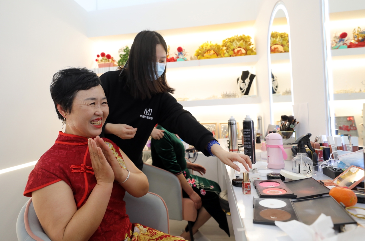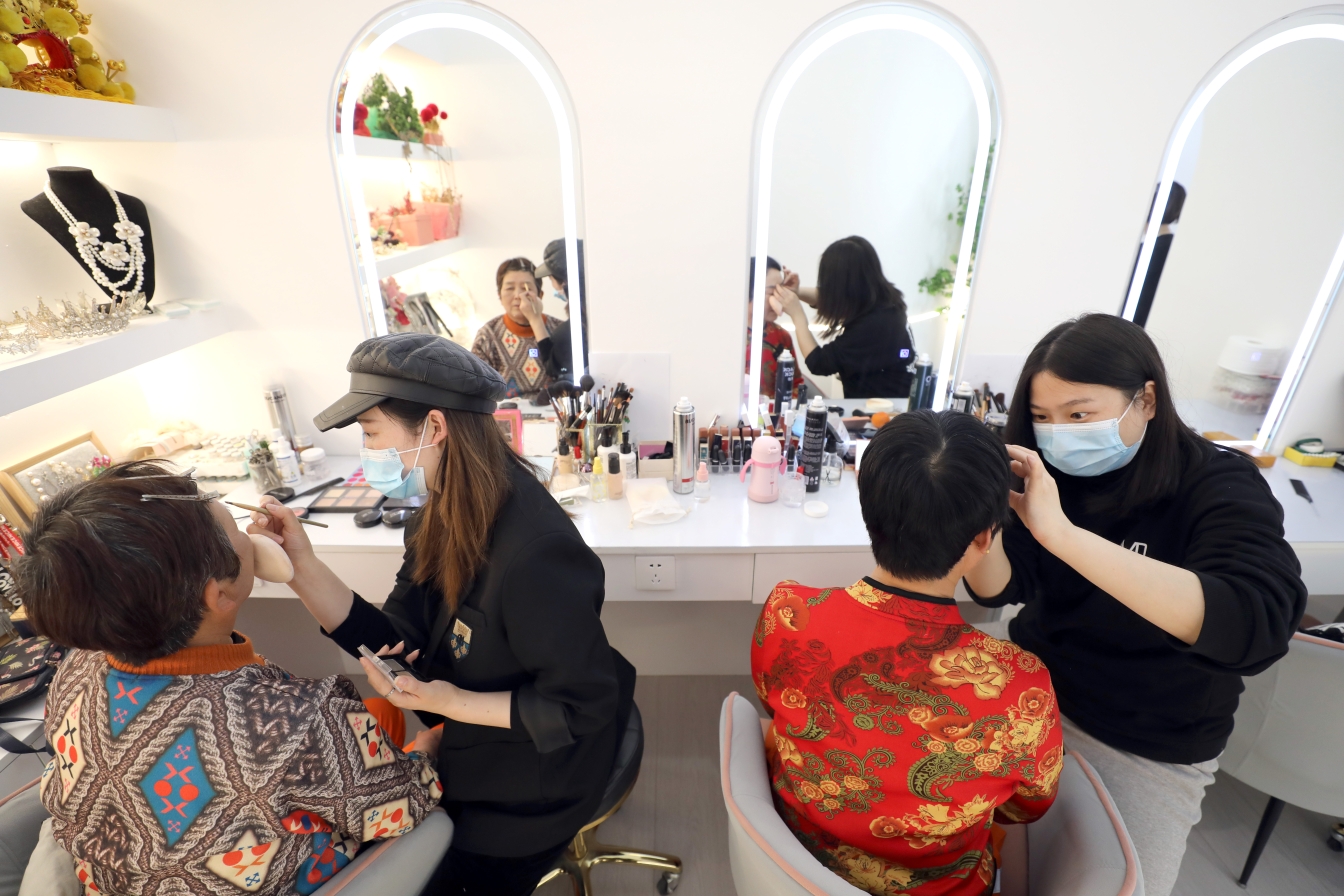 拍出的照片还要精修,徐曼拿出手机对着电脑拍了一张,“我发给家里人看看,看他们能认出我不。”陈亚维和王亚丽则拿出手机为彼此拍了一张带妆照,“希望用这张照片记录下这难忘的一刻。”