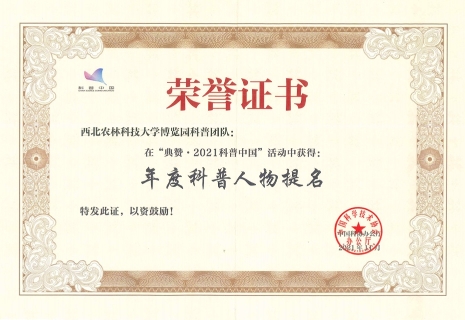 三秦都市报-三秦网讯(记者 孙建恒 通讯员 郑豪) 日前,中国科协公布了“典赞·2021科普中国”年度科普人物提名,西北农林科技大学博览园科普团队从1344项参评项目中脱颖而出,荣获年度科研科普人物提名(全国共10个)。
