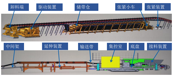 智能自移式可伸缩连续皮带输送系统机尾配置了行走履带及红外测距设备,具备自动跟机作业、皮带中心纠偏和皮带跑偏调节的功能,减少了带式转载机拉机尾的环节。