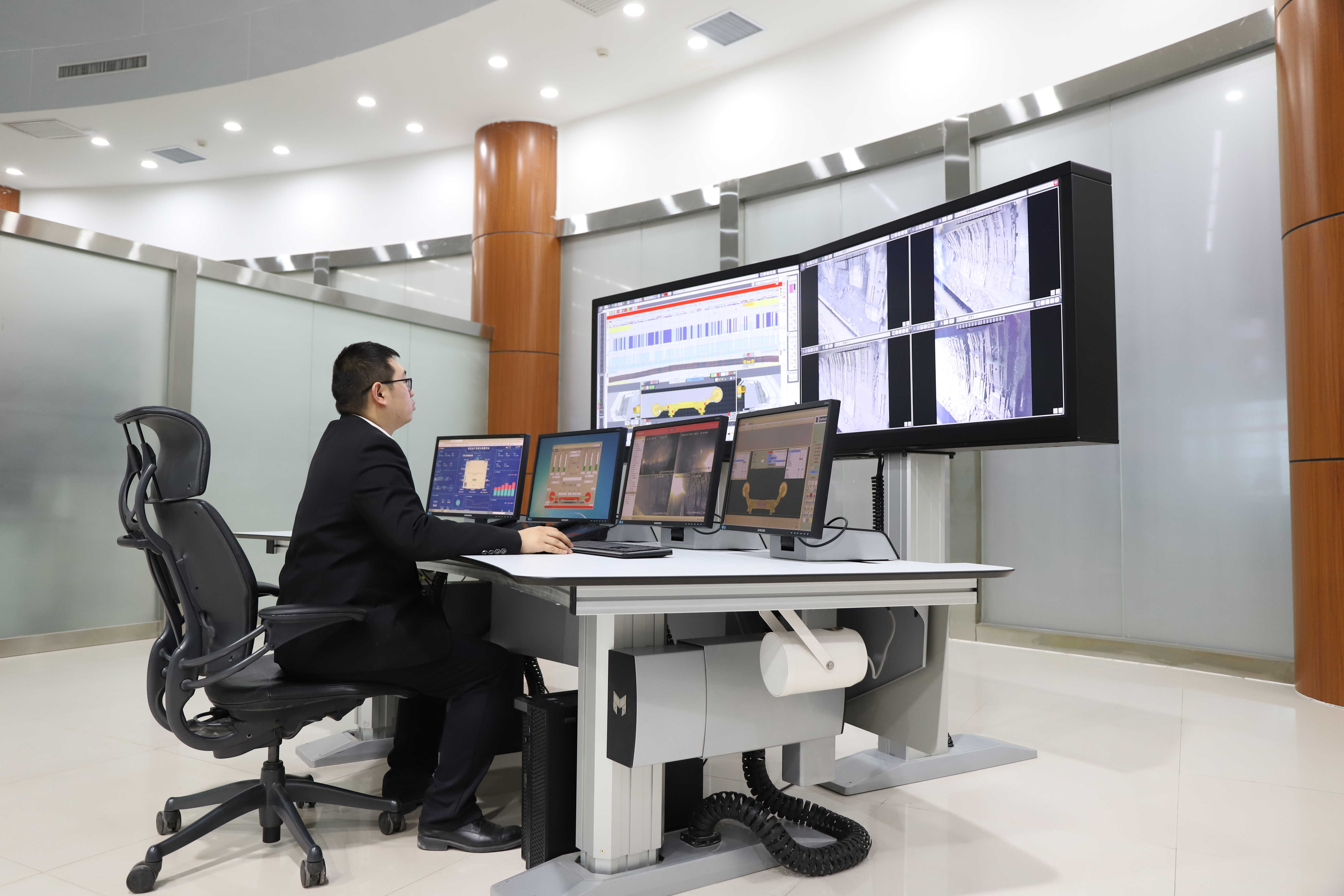 “超前支架已到位,采煤机、刮板运输机已调试完毕……”在二号煤矿调度分控中心内,“采煤机司机”正坐在调度台上,一边监测着井下设备的各项数据,一边在与井下视频确认设备状态,割煤、移架、推溜,滚滚乌金顺着皮带源源不断进入煤流系统……