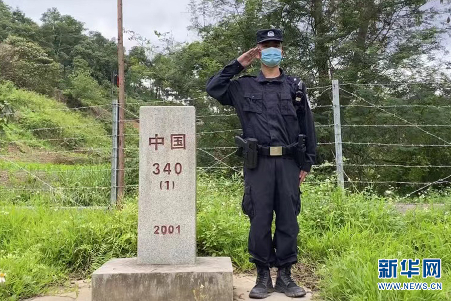 张俊巡逻途中与界碑合影(资料图)新华网发。(天保出入境边防检查站供图)