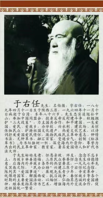 于右任先生一生忧国忧民,清正廉明,在各个领域特别是文化和书法艺术上作出卓越贡献,其人格魅力一直感染着华夏子孙。他是中国书法历史长河中一颗璀璨的明珠,其书法作品为海内外文化机构和人士收藏,被誉为“旷代草圣”。