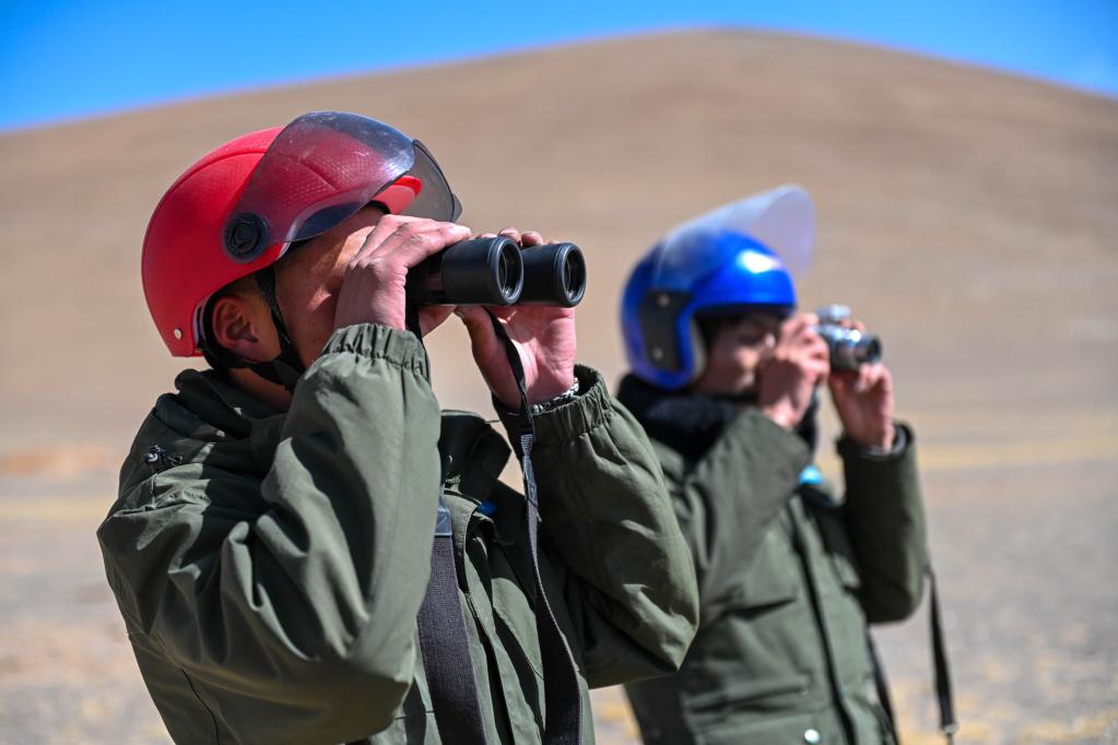 洛桑日达(左)与队友正在观察野生动物。新华社记者周荻潇 摄
