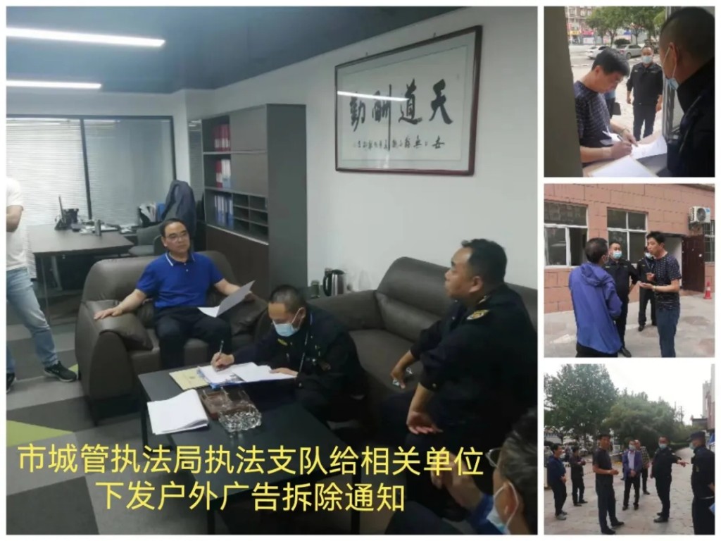 在市中心,执法人员分别向东银大厦,大唐购物中心等单位下发楼顶户外广告拆除通知书,为下一步广告集中拆除工作做足功课,打下坚实基础。此次整治活动中,全市将有20余处73块2000余平方米户外大型广告陆续依法予以拆除,城市空间得到净化,视觉效果得到提升。