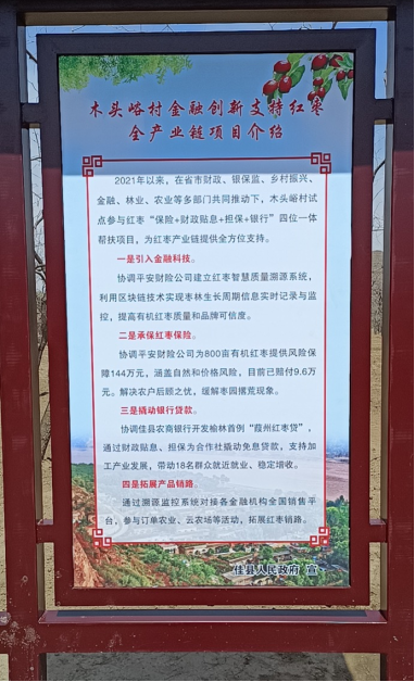 佳县金融创新支持红枣全产业链项目是平安产险陕西分公司重点支持项目,项目充分运用平安各项资源优势:一是引入金融科技,运用平安智慧质量溯源系统,助力佳县红枣创品牌、提收益。二是提供保险保障,开展红枣综合保险,涵盖自然和价格风险。三是撬动银行贷款。平安产险陕西分公司支持25万元资金用于佳县乡村振兴产业发展基金,助力当地涉农企业低成本获取贷款,并提供18个就业岗位。四是拓展产品销路。将产品上线平安好车主、平安好生活等平台,通过云农场各类活动引流,拓展红枣销路。
