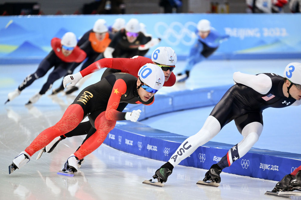 2月19日,中国选手宁忠岩(前左一)在北京冬奥会速度滑冰男子集体出发半决赛比赛中。新华社记者王建威摄