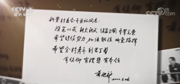 “携笔从戎、能文能武、保家卫国、参军光荣。希望继续努力,加强锻炼、听党指挥。希望全村青年刻苦学习。有信仰、有理想、有本领。” 黄旭华 2022.3.26