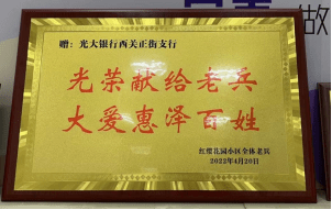 “光荣献给老兵,大爱惠泽百姓”,牌匾上的12个大字,表达了老兵们对陕西省军民融合办认定的首批“特色支行”——光大银行西安西关正街支行前往小区上门办理优待证申领及信息采集工作的高度认可。