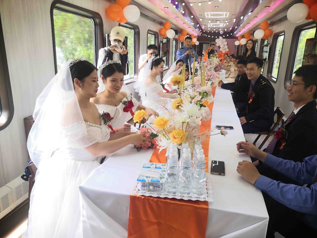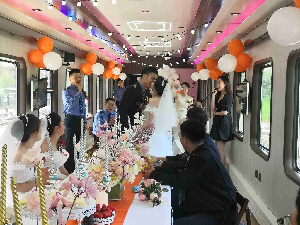 主题列车车厢内花团锦簇,布置精致,青春和浪漫的气息迎面扑来,新人们纷纷打卡留念,记录这幸福的瞬间。列车开车后,暖场游戏“水果蹲”“击鼓传花”拉开了列车联欢的帷幕,十对新人分别与伴娘、伴郎团、青年职工分为两组在不同装饰的主题车厢内进行游戏互动,列车婚礼主持人向新人们介绍了游戏规则。“我来比划你来猜”“默契大考验”“数字炸弹”“答非所问”等游戏互动环节逗得现场观众哈哈大笑,新人们在欢笑声中感受对方的关爱和彼此的祝福。
