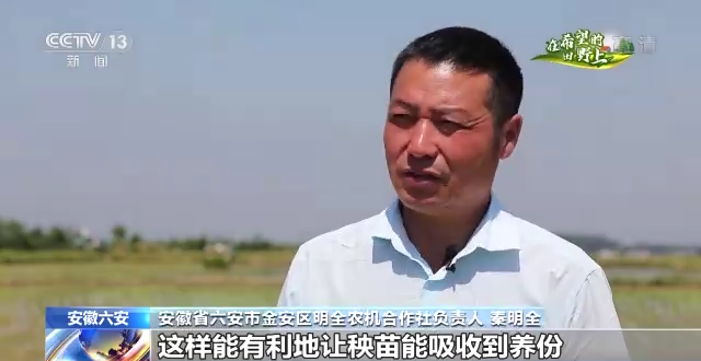安徽省六安市金安区明全农机合作社负责人 秦明全:这样能有利地让秧苗能吸收到养分,减少了肥料成本,每亩能减少40%以上,降低了农业面源污染。我们现在种植全部都是绿色水稻。