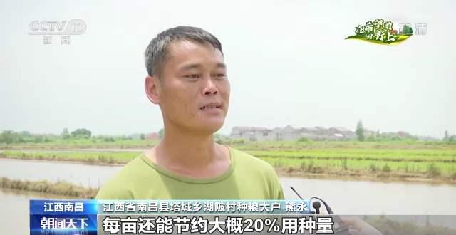 江西省南昌县塔城乡湖陂村种粮大户 熊永:种子撒得均匀,每亩还能节约大概20%用种量,人工播种的话每天只能完成30亩地左右,使用无人机一天可以完成400多亩的播种,效率是人工工作的十倍。