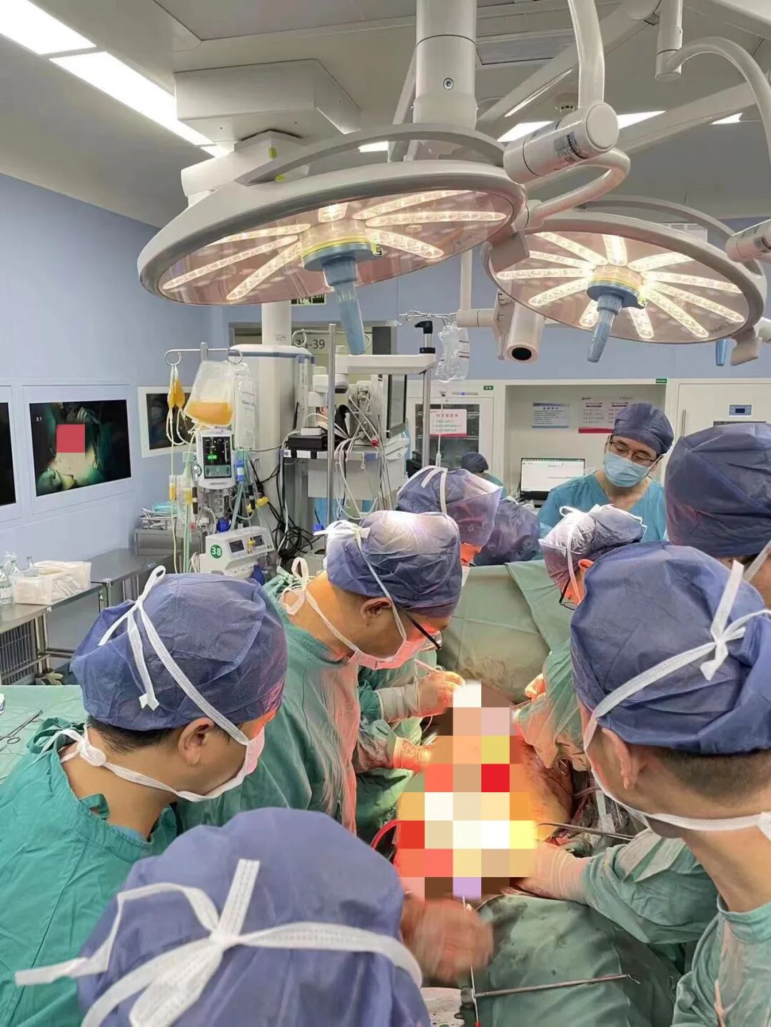 惊心动魄!仰卧体位、经口插管维持全麻状态,消毒、铺单......无影灯下,专家们按各自的分工,小心地分离、清创,缝合......在确认走行区脏器及血管安全后,随着“胸外科安全”,“肝胆外科安全”,“泌尿外科安全”,“胃肠外科安全”一系列的口令后,异物被顺利拔出体外。随即胸科医院李文海副院长带领团队实施了气管、支气管膜部破裂、肺破裂及膈肌修补术;肝胆外科袁克文教授团队实施了胰腺探查清创术;泌尿外科杨增悦主任团队实施了左肾切除及膀胱修补术;心脏病医院张金洲副院长团队实施了髂总动静脉血栓取出修补术;消化外科李国才主任团队实施了乙状结肠造瘘及肛周清创置管缝合术。术后为了减小血栓的风险心血管外科在介入杂交手术室顺利植入了下腔静脉滤器。