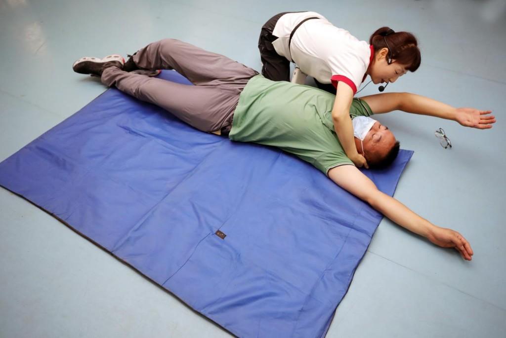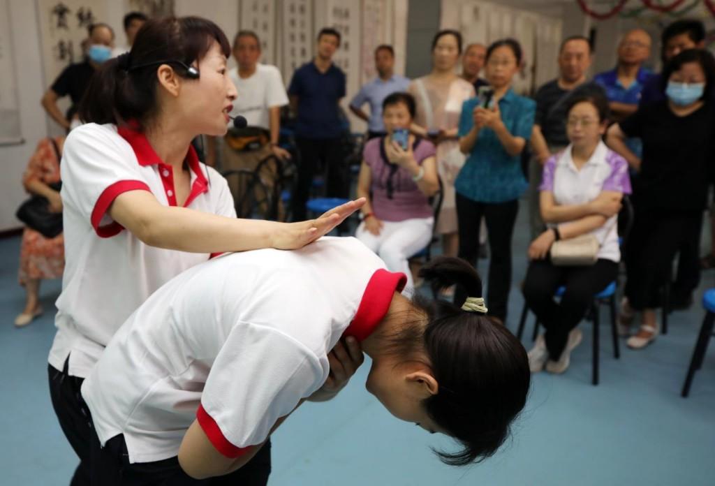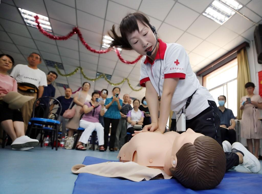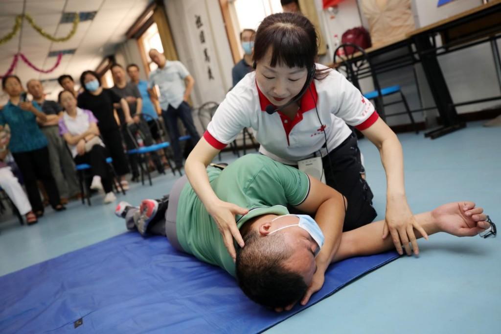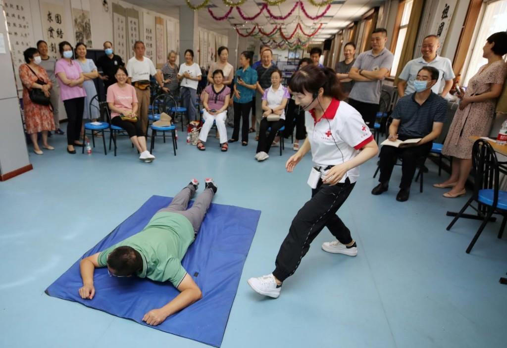 这时西安市红十字会急救护培训师赶快冲到“晕倒者”的身旁,将“晕倒者”翻过身,让他仰卧平躺在地面,检查其有无摔伤,一边安排拨打120,一边现场为“晕倒者”实施心肺复苏急救……其实这是8月4日上午,在西安科技大学社区“关爱生命·救在身边”应急救护培训课堂上的一幕。