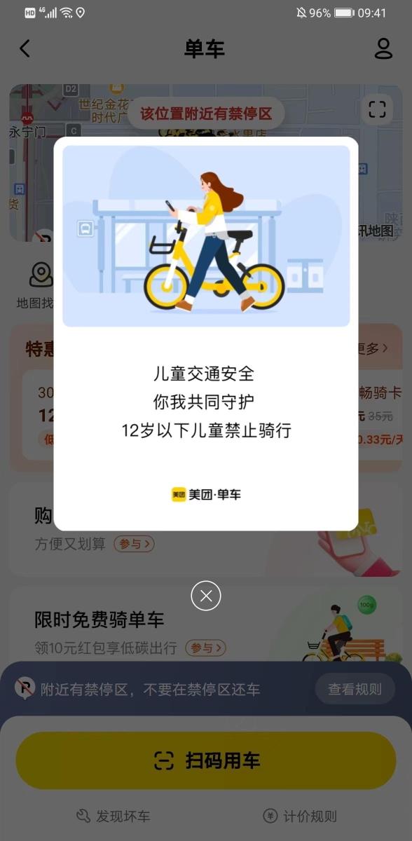 美团单车介绍,美团单车禁止12岁以下的未成年人骑行,实名注册的用户必须年满16周岁。在用户协议中,美团单车严格要求用户必须符合法定骑行上路年纪,对用户信息的真实合法性、身体健康状况等也有明确规定。同时,用户在扫码开锁时有明确提醒,车身挂篮上或横杆处也有相应标识。