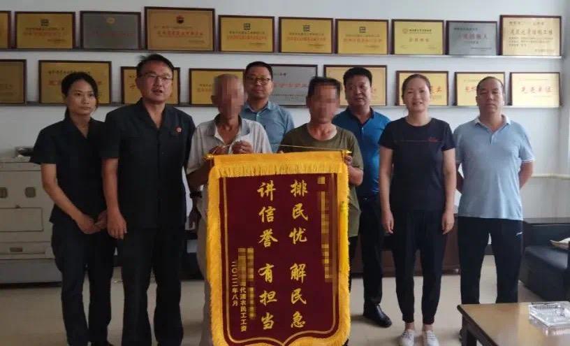 为切实维护农民工合法权益,付法官主动添加第一被告田某微信尝试调解,无奈沟通无果。付钊法官进而与被告某建筑公司沟通,从维护企业商誉角度进行劝导,随后该建筑公司表示愿意积极配合,项目经理当场表示愿意先行向两位农民工垫付工资,并立即通知财务完成转账。随后,卢某、曹某依法申请撤回起诉,并向企业送上表达感激之情的锦旗。