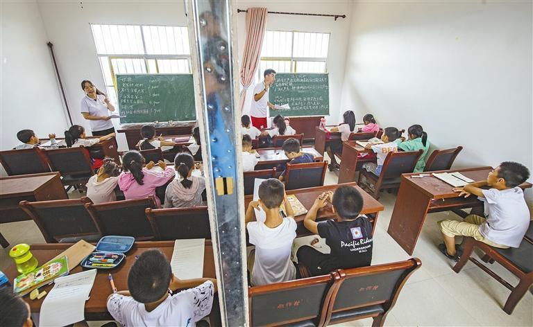 8月24日,支教老师姚丁鸣(左)、张一琛(右)分别给孩子进行课业辅导。 记者 袁景智摄