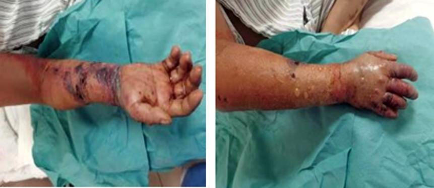8月14日中午,感染科何英利主任接到急诊科会诊电话,医院收治了一位皮肤软组织感染的患者。患者右前臂大量暗红色水疱,有淡红色液体流出,右上肢皮肤张力高,疼痛难忍,伴高热。接到电话后何主任立即赶往急诊科,经初步诊断后为“炭疽待排”。